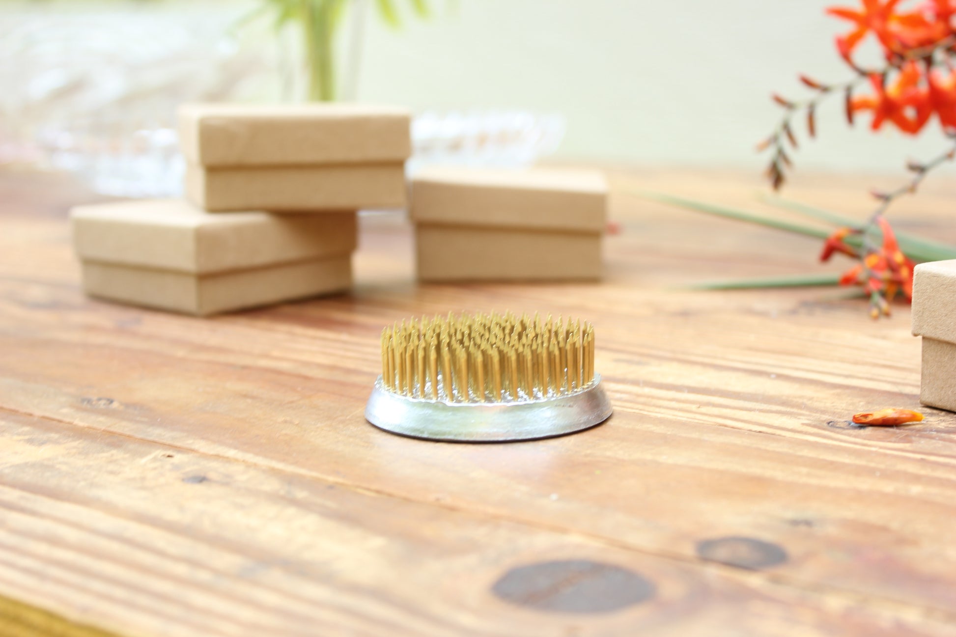 Ikebana is the ancient Japanese art of floral arranging. A kenzans (剣山) (or "sword mountains") are the foundations of any ikebana arragement. The pins of the kenzan pierce the base of botanical stems, which holds them in place. Ikebana allows students to experiment with shape, movement, subtlety, balance, and harmony.